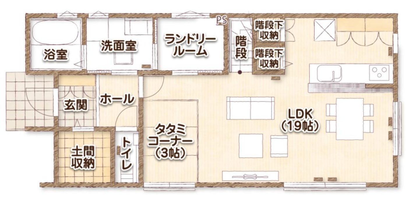 また、階段下収納や土間収納など、複数の収納スペースを設けることで、家全体を整理整頓できる工夫が凝らされています。