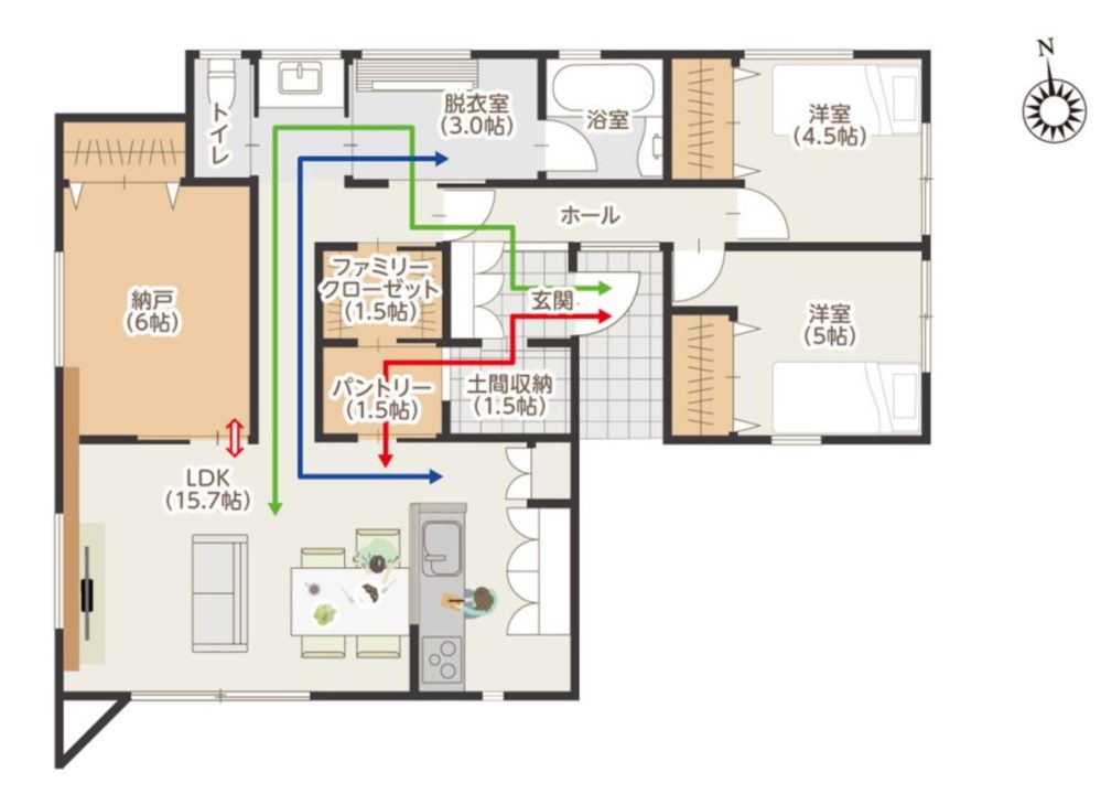 整理整頓しやすい動線設計となっているため、リビングに物を散乱させなくて済むのがうれしいポイントです。