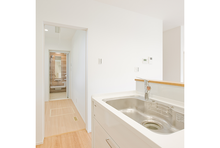 キッチン〜洗面室〜浴室と家事が発生するスペースを一直線にすることで、家事時間の短縮に繋がります。