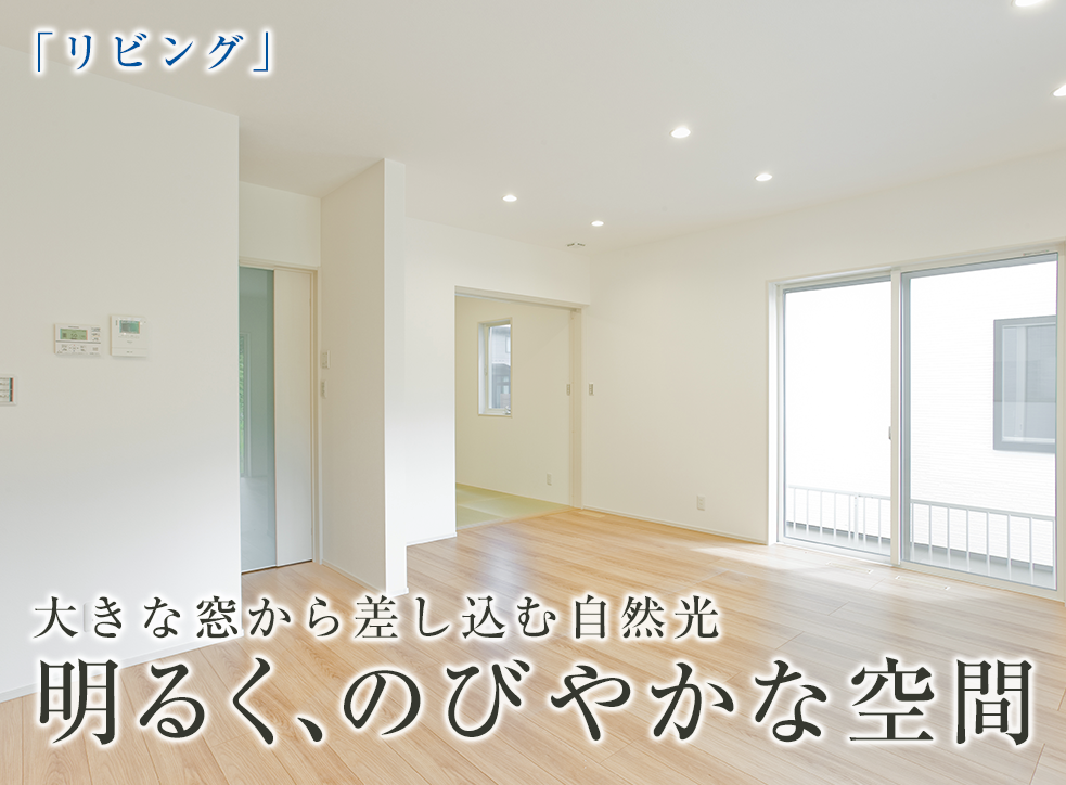 大きな窓から差し込む自然光と、心地よく抜ける風。家族が自然と集まるリビングは、日々の暮らしに“明るさ”と“開放感”をもたらします。