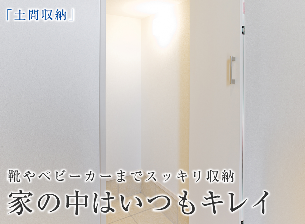 土足のまま出入りできるので、靴類はもちろんのこと、アウトドア用品やお子さまの砂遊び道具など、使用後も家の中に汚れを持ち込むことなく、収納可能。