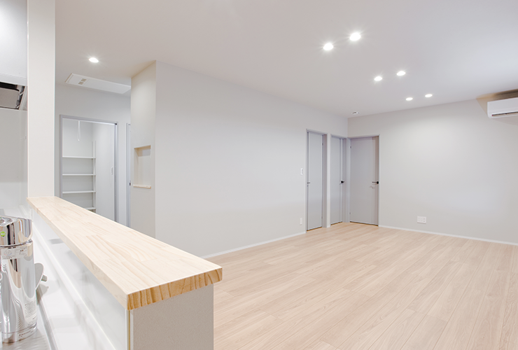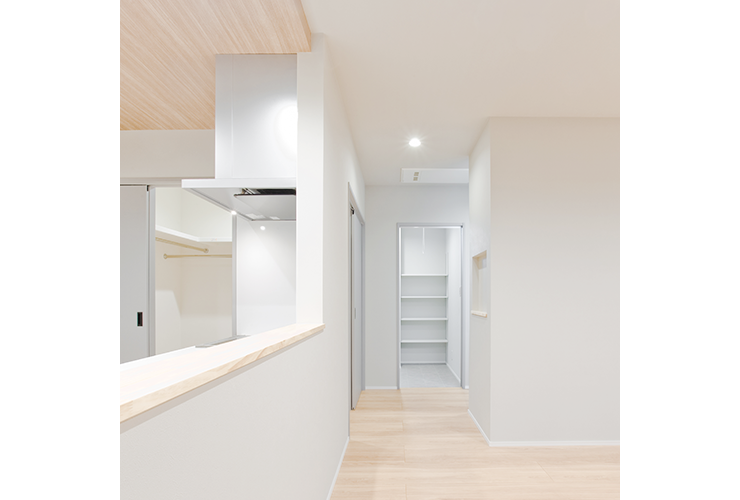 キッチン〜洗面室〜浴室と家事が発生するスペースを一直線にすることで、家事時間の短縮に繋がります。