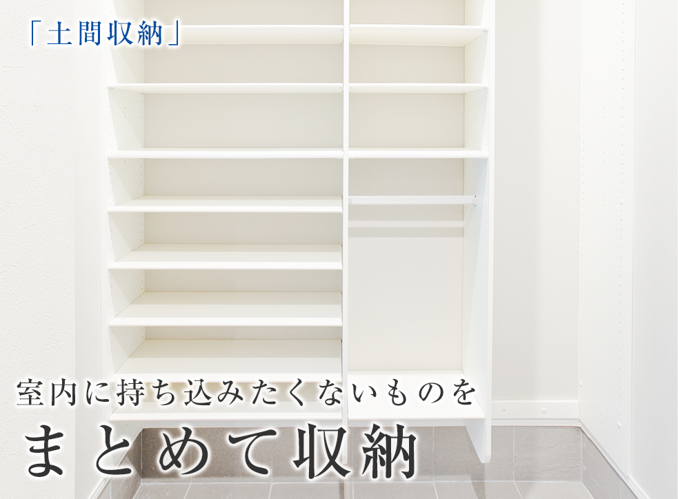 土足のまま出入りできるので、靴類はもちろんのこと、アウトドア用品やお子さまの砂遊び道具など、使用後も家の中に汚れを持ち込むことなく、収納可能。