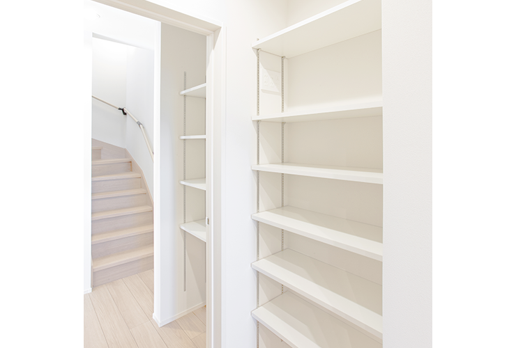 週末のまとめ買いOKの大容量のパントリー。物があふれることなく、いつもすっきりキレイな空間を保てます。