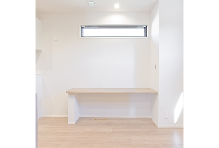リビング内に設けたカウンターは、子どもの勉強スペースやPCスペース、家事コーナーとして家族のコミュニケーションを育む設計になっています。