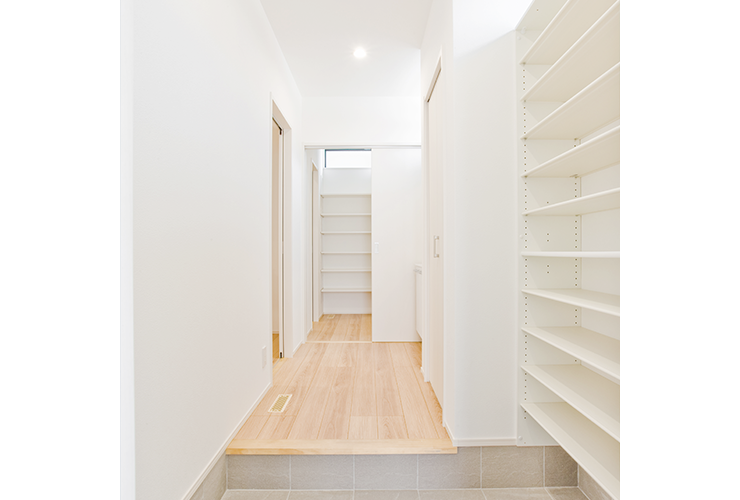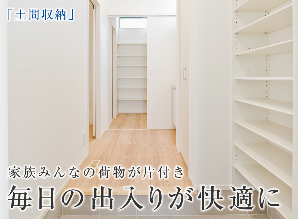 土足のまま出入りできるので、靴類はもちろんのこと、アウトドア用品やお子さまの砂遊び道具など、使用後も家の中に汚れを持ち込むことなく、収納可能。