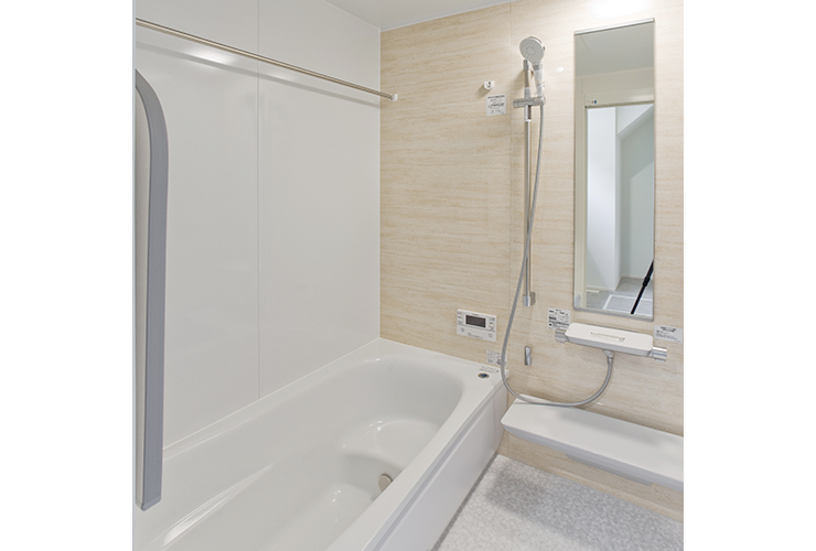 ゆったりとした浴槽で一日の疲れをしっかり癒せます。汚れがつきにくい素材や、排水・換気がスムーズな設計で毎日のお手入れもラクラク。