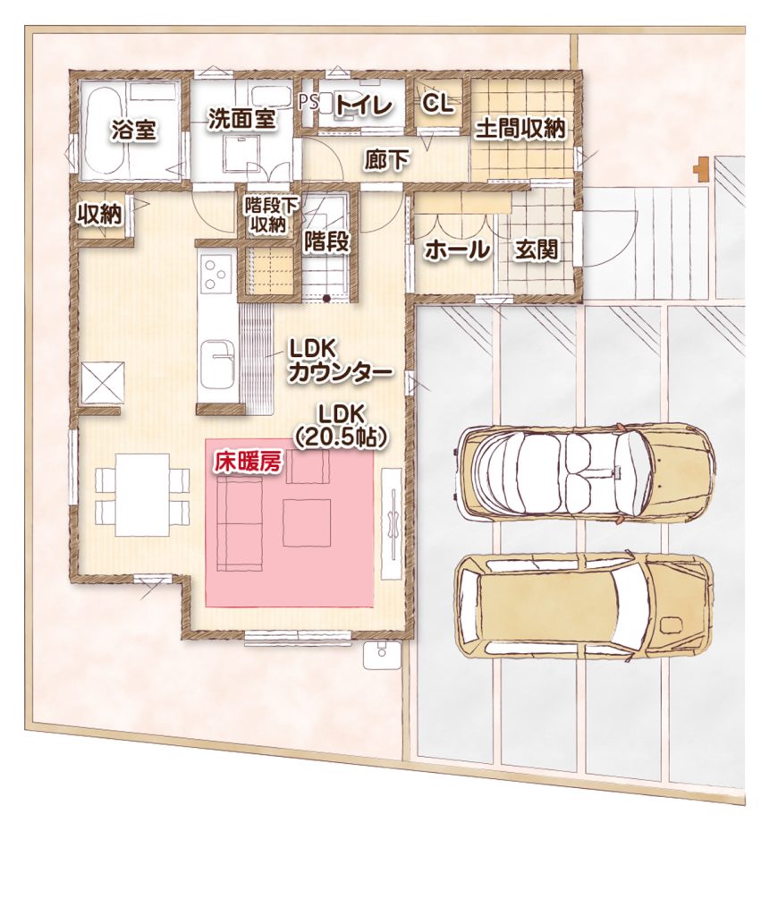 リビングは広々空間の21.5帖!さらに床暖房が標準装備!