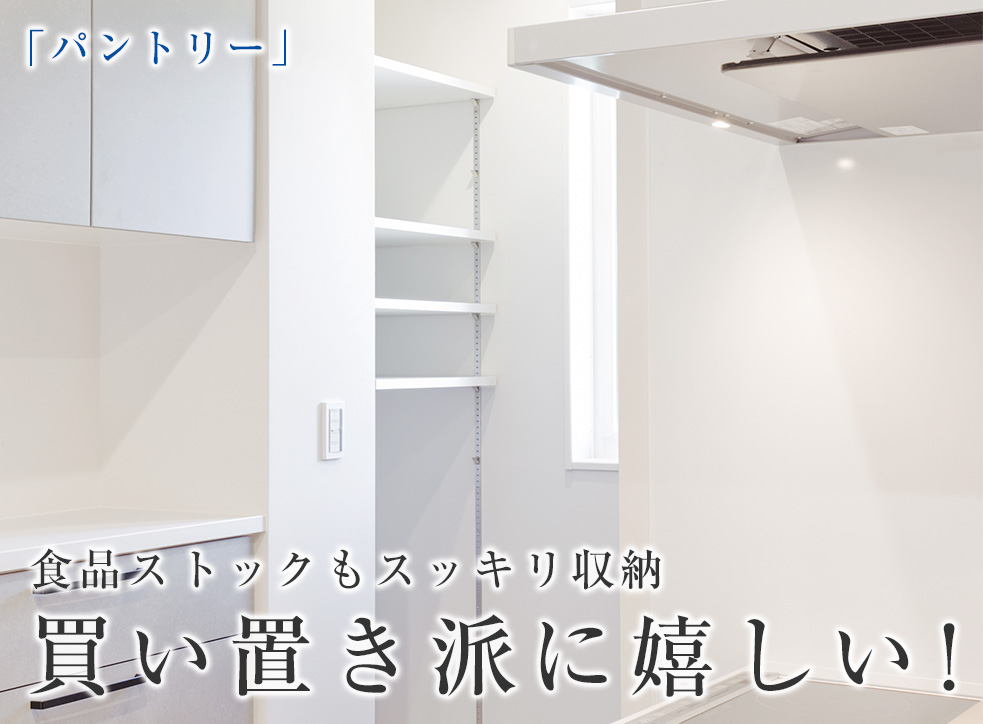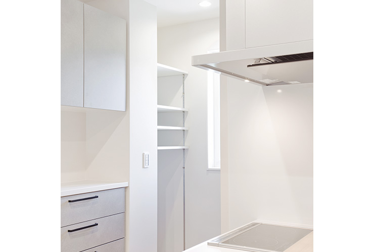 週末のまとめ買いOKの大容量のパントリー。物があふれることなく、いつもすっきりキレイな空間を保てます。