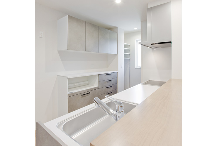 小さなお子様を見守りながら料理ができ、家族との会話も弾むキッチン。カウンター越しに配膳できるため、家事動線もスムーズです。