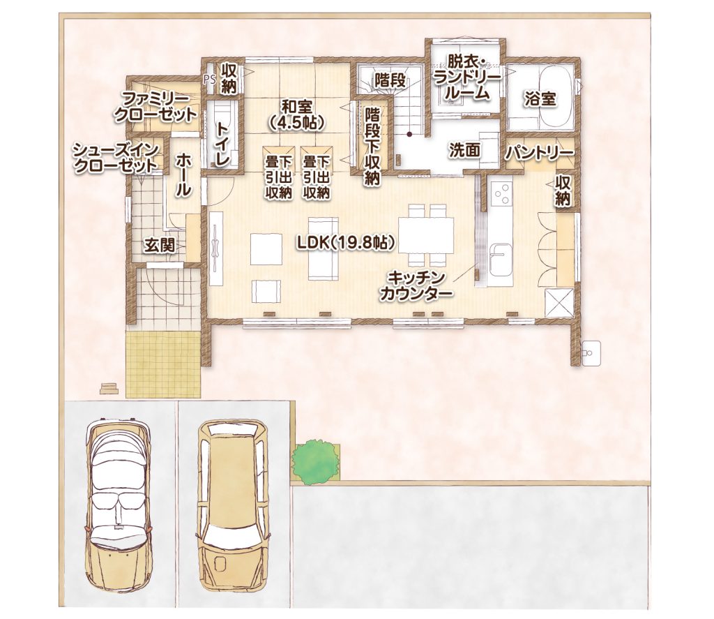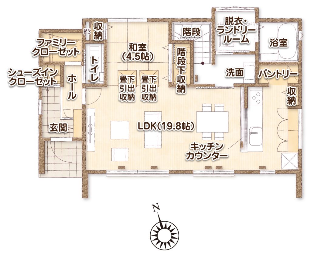 洗濯まわりの作業を行うスペースを設けることで、「洗う、干す、取り込む、アイロンがけ、畳む」作業を一室で連動して行うことが可能になります。
