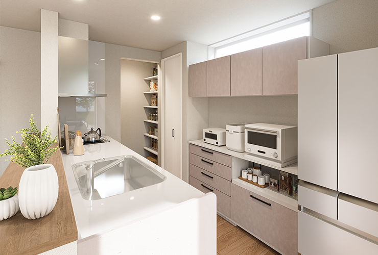 小さなお子様を見守りながら料理ができ、家族との会話も弾むキッチン。カウンター越しに配膳できるため、家事動線もスムーズです。