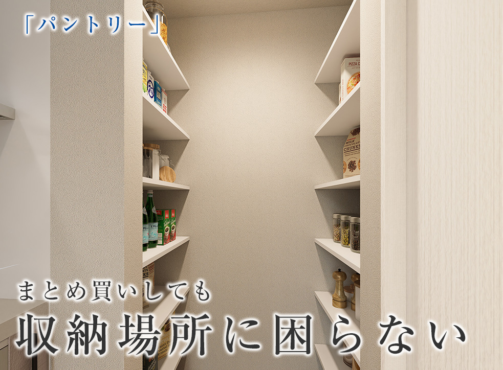 週末のまとめ買いOKの大容量のパントリー。物があふれることなく、いつもすっきりキレイな空間を保てます。