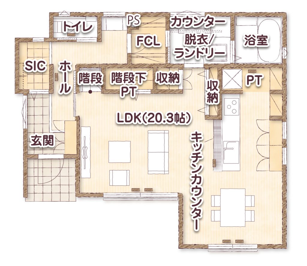 小さなお子様を見守りながら料理ができ、家族との会話も弾むキッチン。カウンター越しに配膳できるため、家事動線もスムーズです。