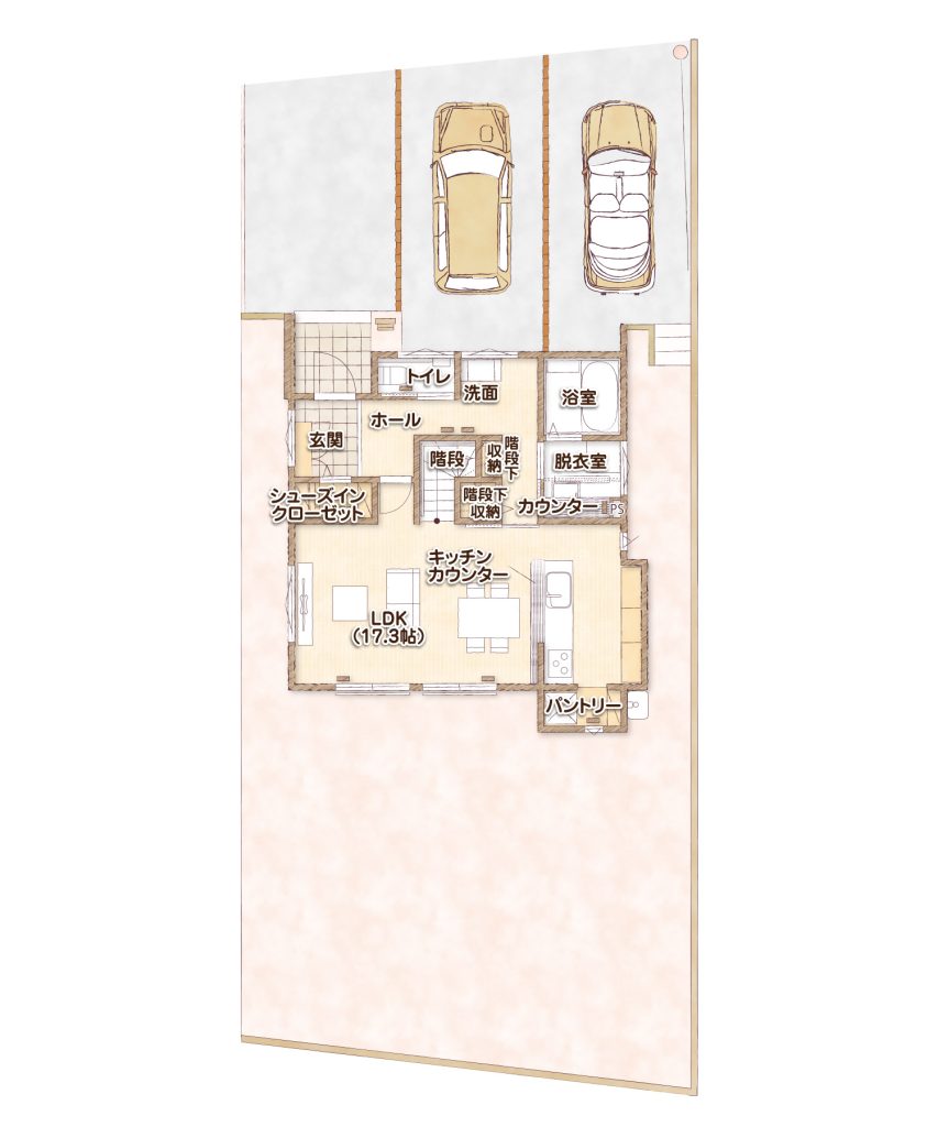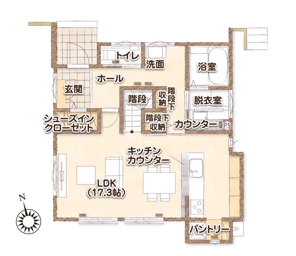 小さなお子様を見守りながら料理ができ、家族との会話も弾むキッチン。カウンター越しに配膳できるため、家事動線もスムーズです。