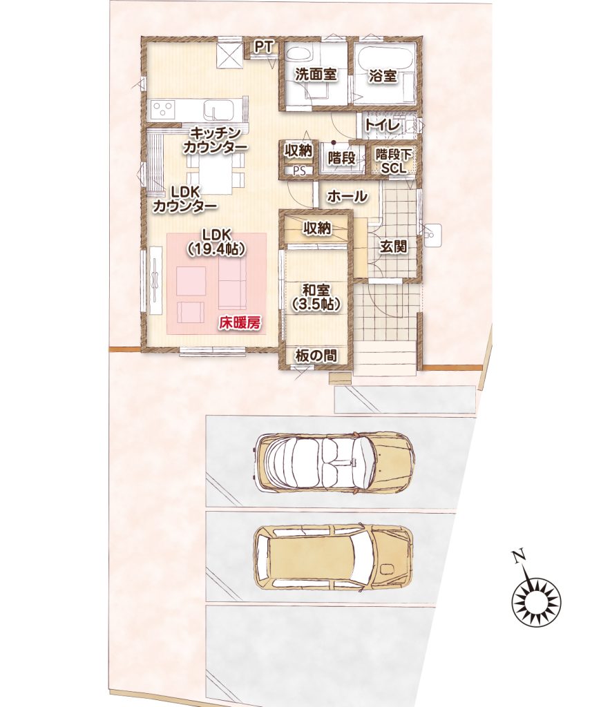 広々玄関ホールには土間収納を備えています。靴、アウトドア道具、ゴルフバックなど屋外で使うことの多いものを収納することで外のホコリや汚れを極力中に持ち込まなくて済みます。